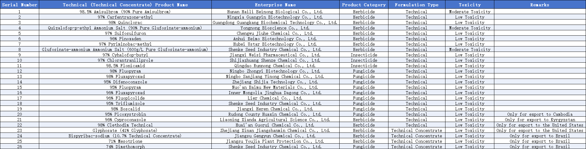 Among the numerous products in this announcement, the 26 new Technical Concentrate (TC) registrations are undoubtedly the centerpiece of the analysis, as they represent the earliest movements in the industry's value chain. This batch includes 22 Technical Grade products and 4 Technical Concentrates, with five of them specifically designated as "for export only," signaling the global ambitions of Chinese agrochemical firms.