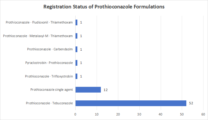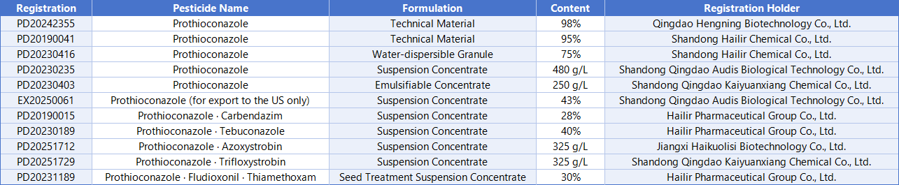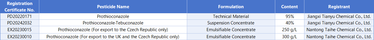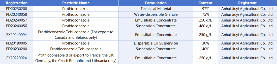 In terms of the registration of mixed formulations, Jiuyi Co., Ltd. has registered 2 products that are mixtures of prothioconazole and tebuconazole.