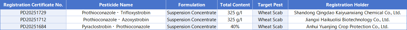 China's agrochemical market has recently witnessed a pivotal product evolution. Three new combination products for the major fungicide prothioconazole have been officially approved for registration. All three combine prothioconazole with QoI (Quinone outside Inhibitor) fungicides—namely trifloxystrobin, azoxystrobin, and pyraclostrobin—and are all designated for the control of Fusarium head blight (FHB) in wheat. This development not only significantly enriches the prothioconazole product portfolio but also signals a fundamental break from its long-standing, relatively monolithic combination model.