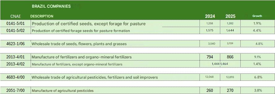 The growth in the crop protection sector is not an isolated case but is reflective of a thriving trend across the entire agricultural inputs industry. Data shows that organo-mineral fertilizer manufacturing led the charge with a 9.1% increase, while conventional fertilizer manufacturing companies grew by 1.4%. The production of certified forage seeds for pasture establishment and related wholesale trade also saw solid growth of 4.4% and 4.8%, respectively.
