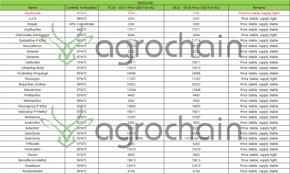 Most herbicide prices remained stable, except for glyphosate. Glyphosate rose by $28, from $3,754 per ton to $3,782 per ton.