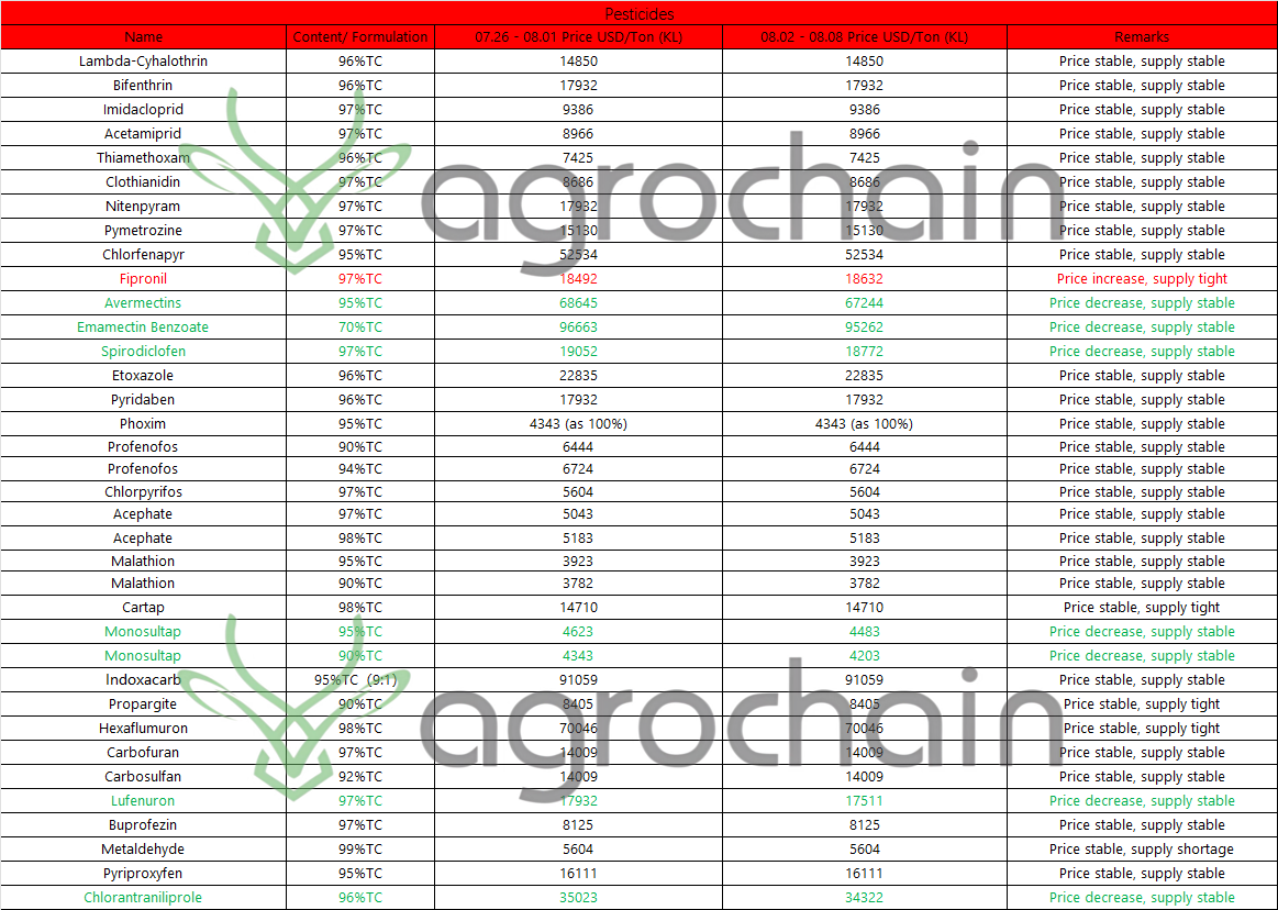 The Agrochain platform updates the price trends of pesticides for you every week. Please keep following us or log in to the Agrochain platform(https://www.agrochainhub.com/)to check the comprehensive pesticide prices.