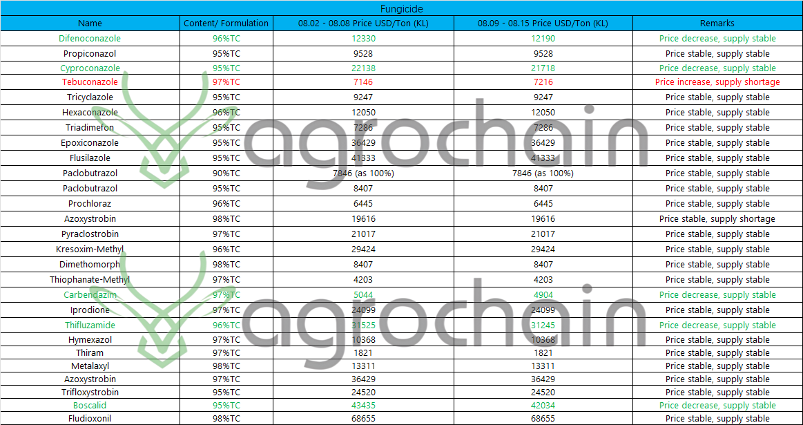 Cyproconazole (95%): Dropped by $420 to $21,718 per ton.