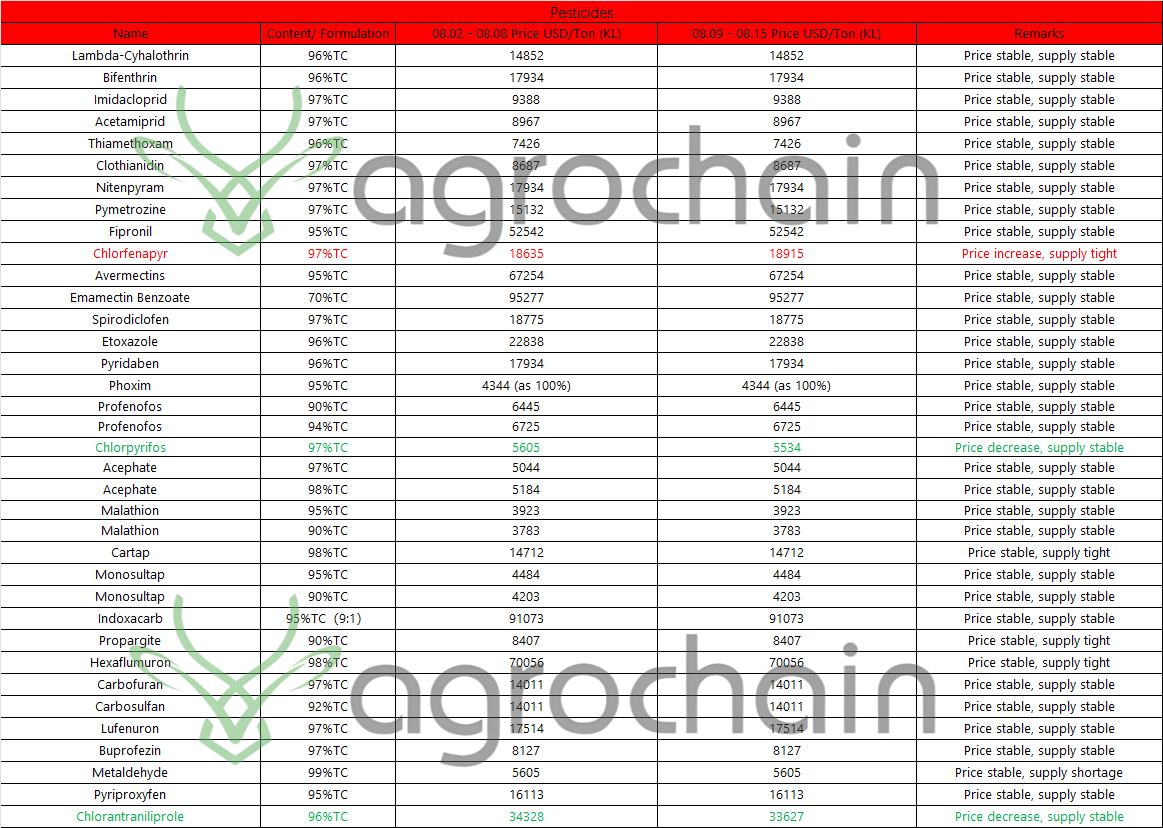 The Agrochain platform updates the price trends of pesticides for you every week. Please keep following us or log in to the Agrochain platform(https://www.agrochainhub.com/)to check the comprehensive pesticide prices.