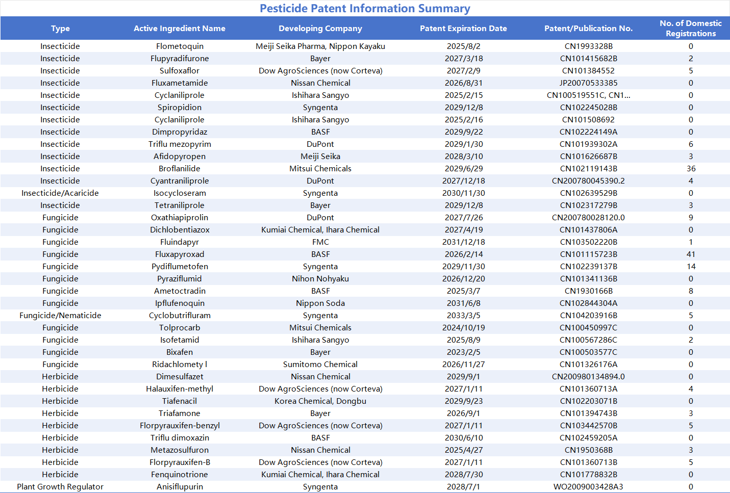 Meanwhile, for the popular products already registered in China, patent expiration signals a complete reshaping of the competitive landscape. For instance, after losing patent protection, compounds like DuPont's Cyantraniliprole and Afidopyropen, as well as Mitsui Chemicals' Broflanilide (which already has 36 domestic registrations), will inevitably trigger fiercer market competition, leading to more rational pricing and ultimately benefiting growers.