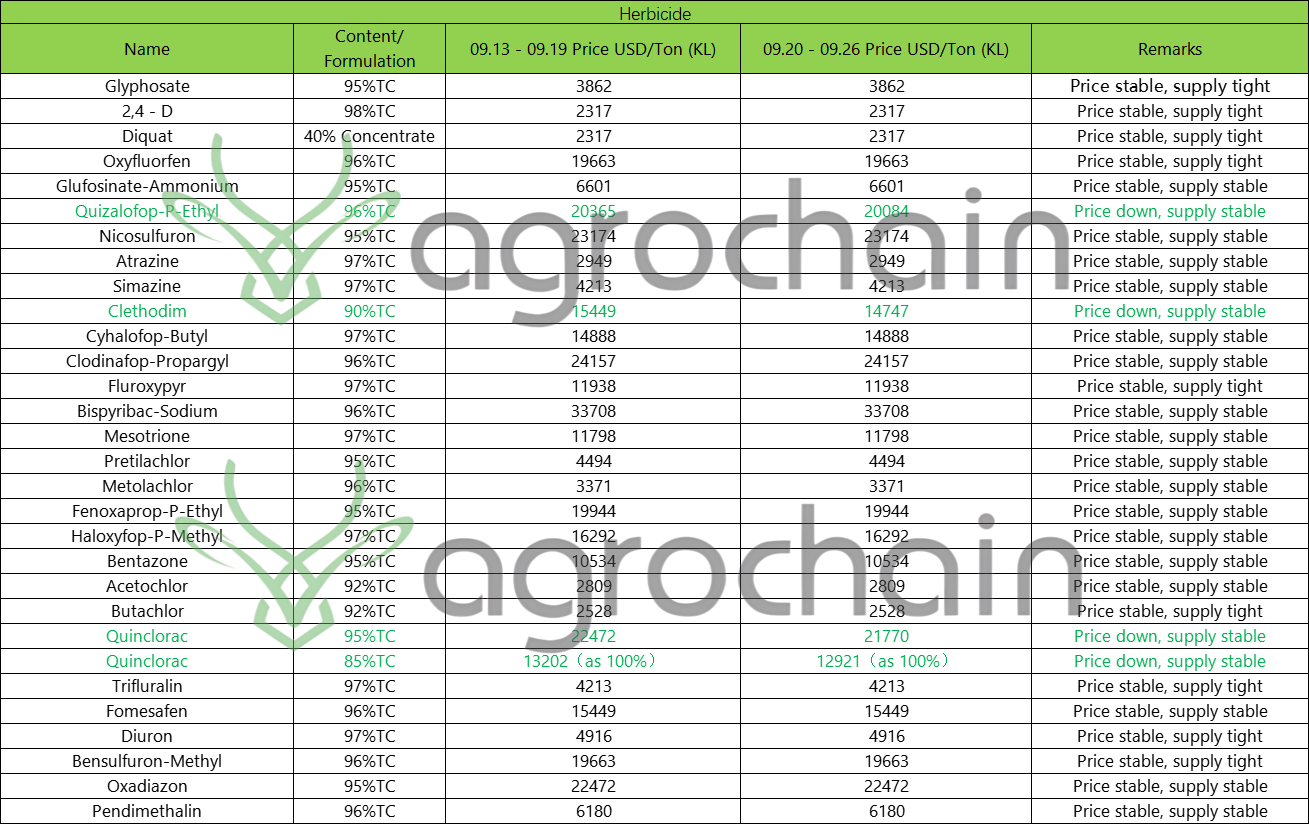 96% Quizalofop-P-ethyl: Down by $281 per ton, currently standing at $20,084/ton;