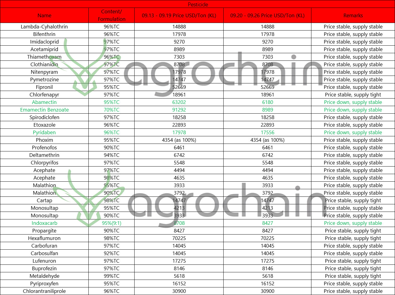 70% Emamectin Benzoate: Also fell by $1,404 per ton, the latest price is $90,028/ton;