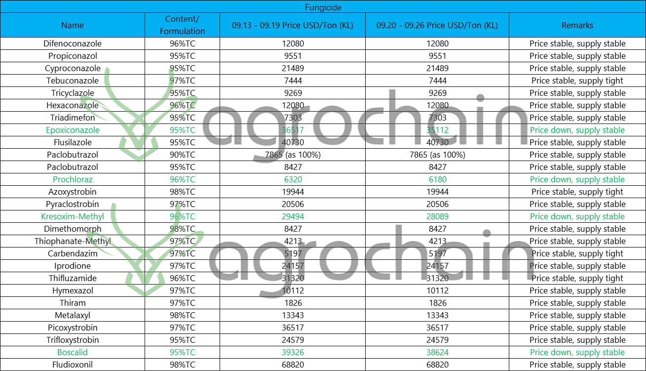95% Epoxiconazole: Down by $1,404 per ton, now at $35,111/ton;