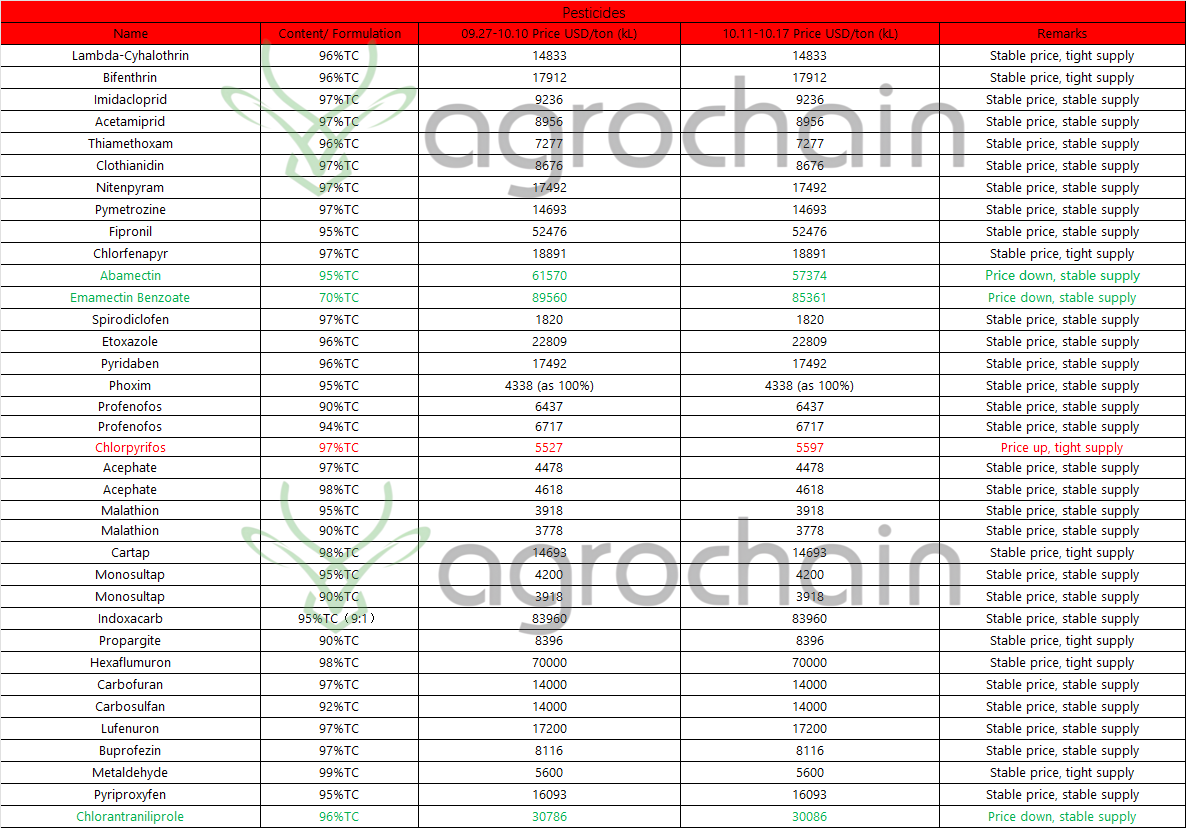 2.Insecticides: Price Increase of chlorpyrifos; Price Drops of Abamectin, Emamectin Benzoate, and Chlorantraniliprole