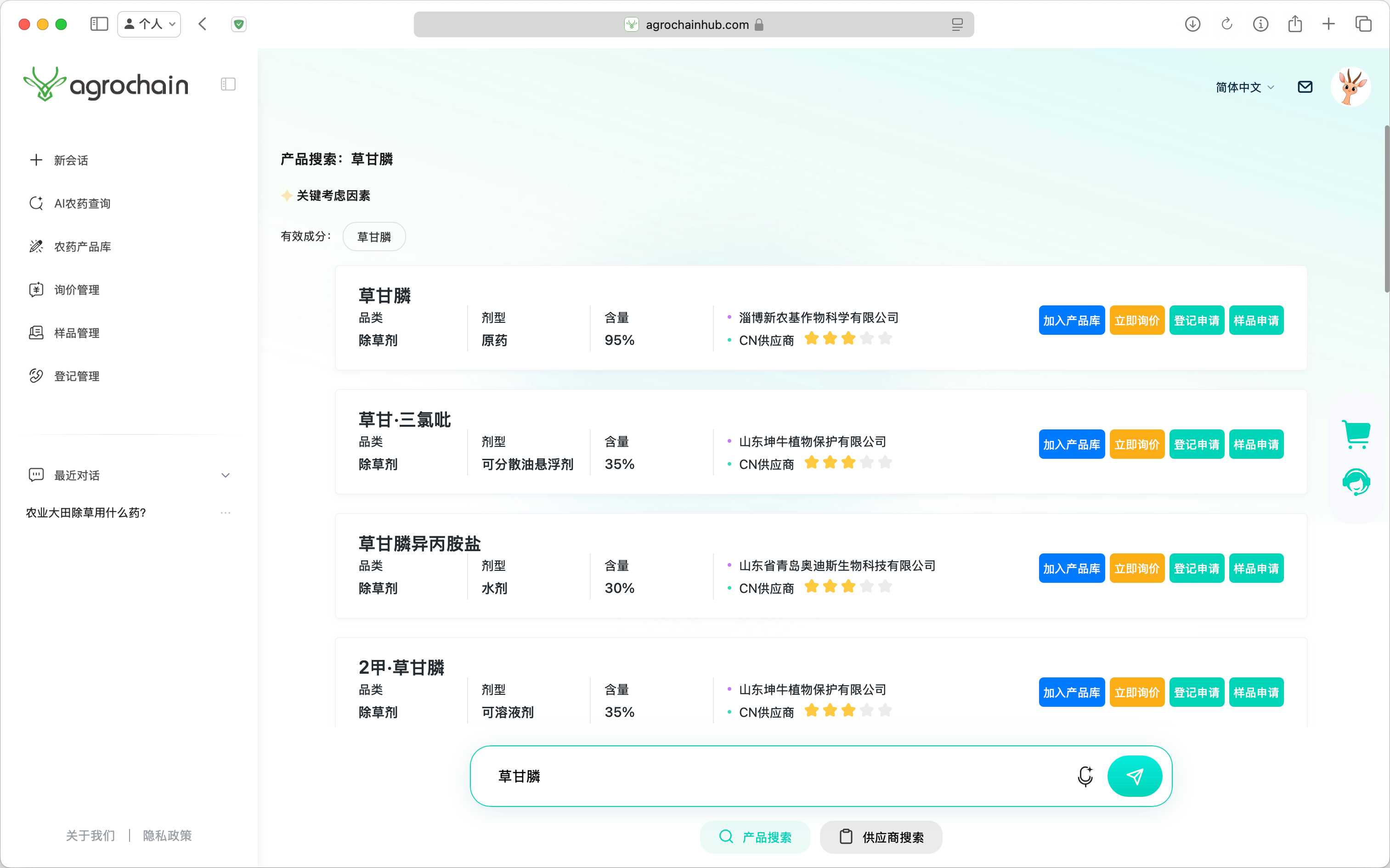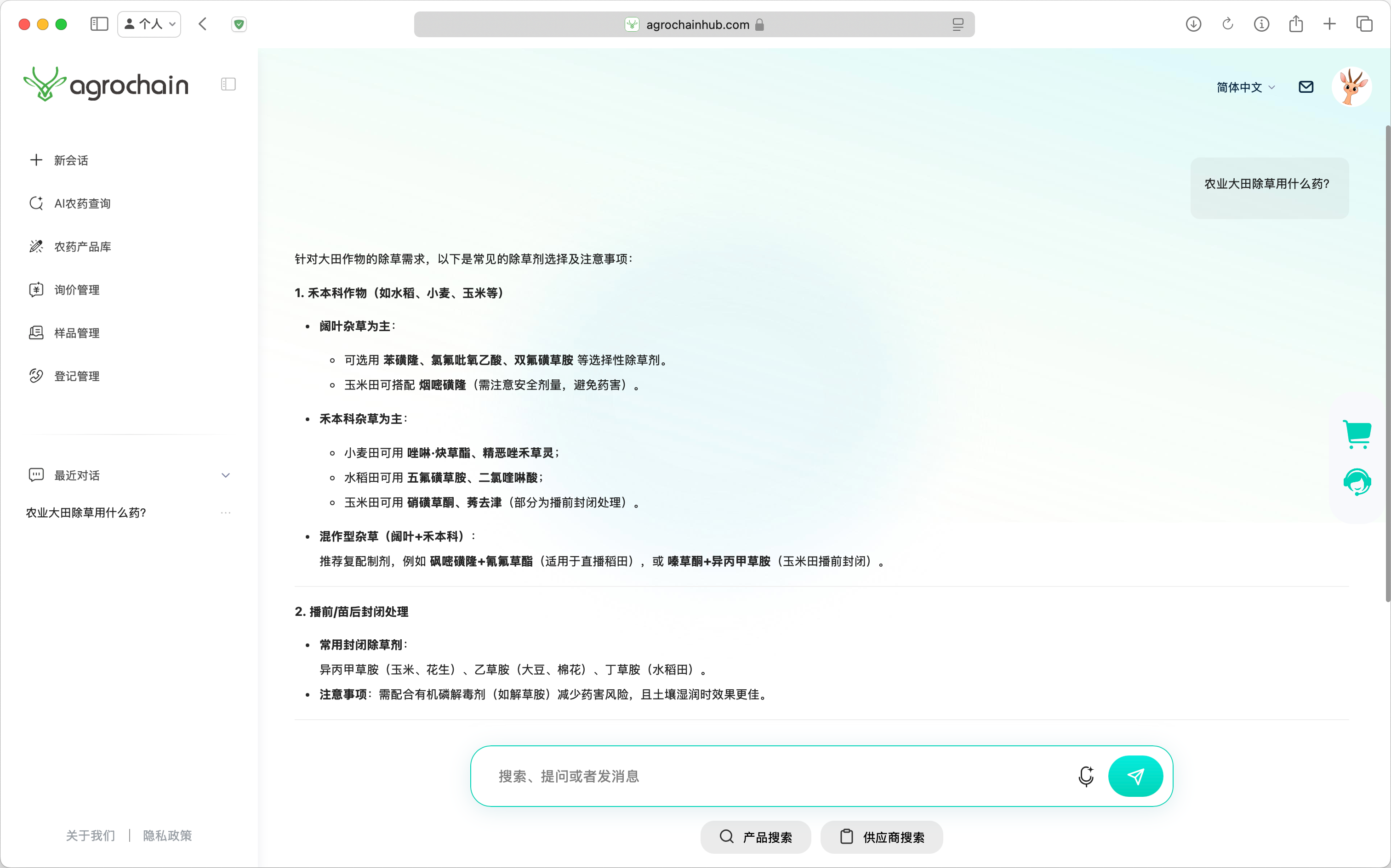 Agrochain's AI Pesticide Search feature utilizes advanced AI technology and our proprietary professional pesticide knowledge base (DeepSeek) to provide you with accurate and intelligent pesticide information queries. Whether you need to understand the composition and usage of a specific product or seek solutions for particular scenarios, simply input keywords or questions to receive expert answers and suggestions.