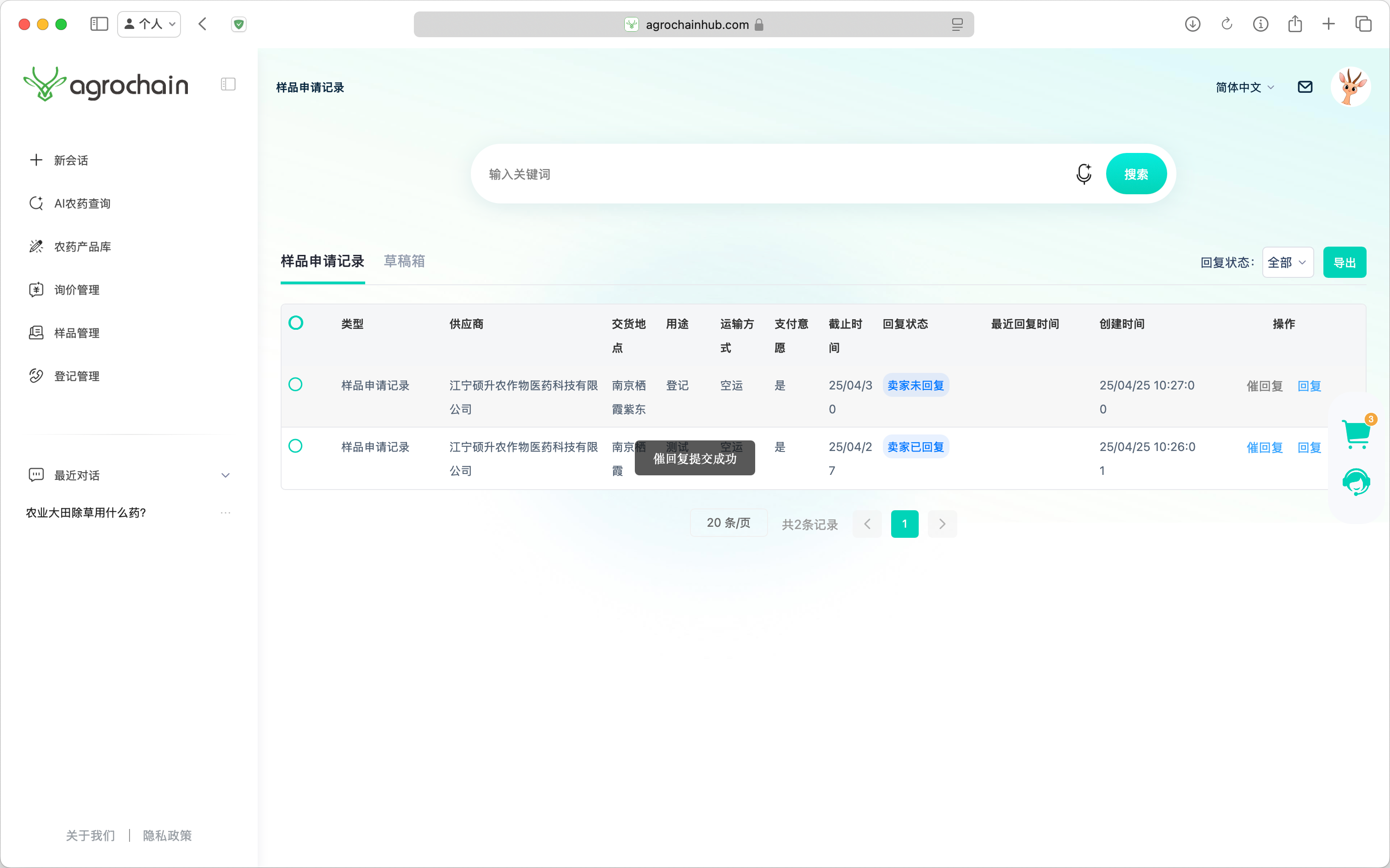 View the processing status (Replied/Pending) of submitted requests in the "Sample Request Records".