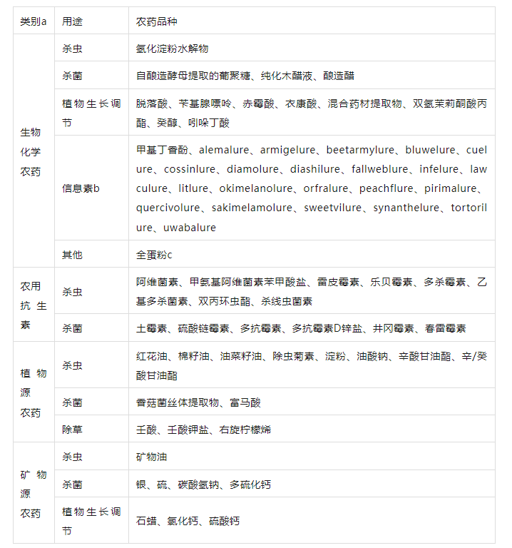 尽管在法规上有所区分,但在推广有机农业时,官方定义的生物农药和一部分经批准的生物源物质农药都被视为绿色生产的重要工具。日本农林水产省发布的**《有机种植投入物清单》**就体现了这种实用主义。如表2所示,该清单不仅涵盖了所有官方定义的生物农药,还囊括了多种经批准的植物源、矿物源及生物化学农药,它们共同构成了日本有机农业标准(JAS)认证农产品的可用工具箱。这些产品大多可豁免制定每日允许摄入量(ADI)和最大残留限量(MRL)。