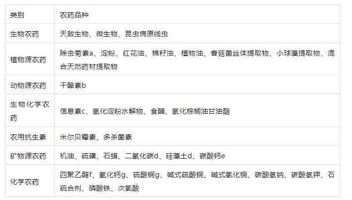 a 自除虫菊提取的;b 用作展着剂的;c 用于农业害虫防治的;d 用于贮藏设施的;e 用于防止铜制剂药害的;f 用于捕虫器的;g 用于波尔多液配制的。 二、 日本生物农药的登记与应用概览