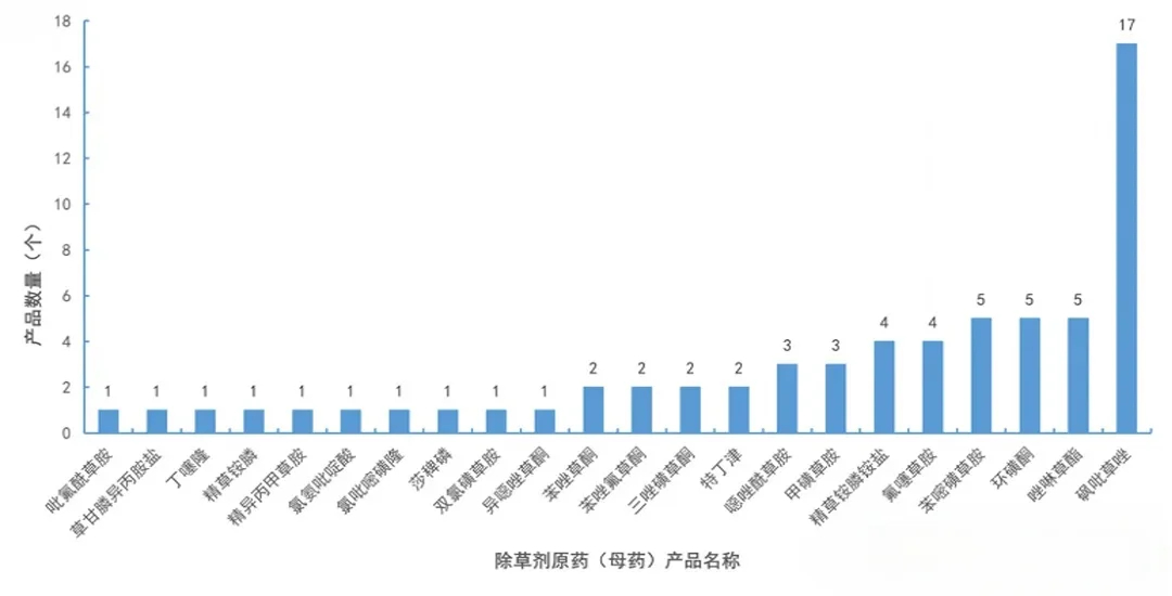 砜吡草唑以17个登记数量一枝独秀,显示出其卓越的市场潜力。苯嘧磺草胺、环磺酮和唑啉草酯(各5个)形成了稳固的第二梯队。精草铵膦铵盐、氟噻草胺等品种亦表现活跃,共同构成了当前除草剂原药的研发与登记热点。.jpeg)