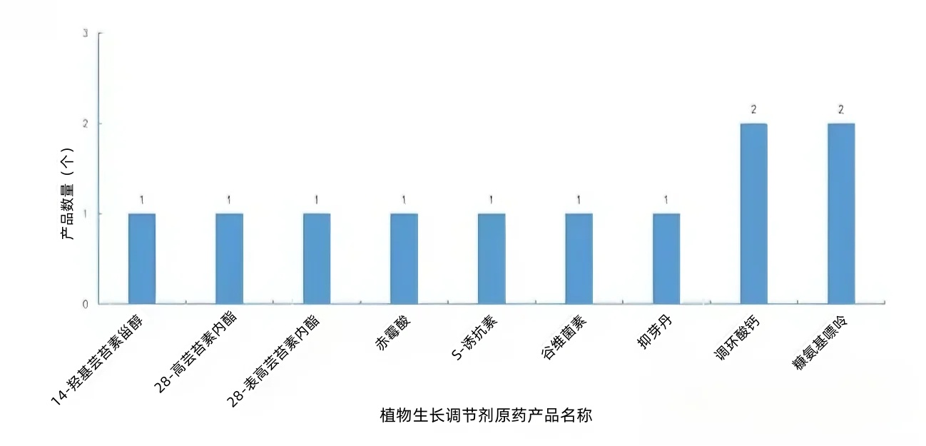 我国2025年半年度共拟批准新增植物生长调节剂原药产品登记数量为11个,有效成分共9个。调环酸钙、糠氨基嘌呤 14-羟基芸苔素甾醇、28-高芸苔素内酯、28-表高芸苔素内酯和赤霉酸等依然是植物生长调节剂原药登记热门产品。
