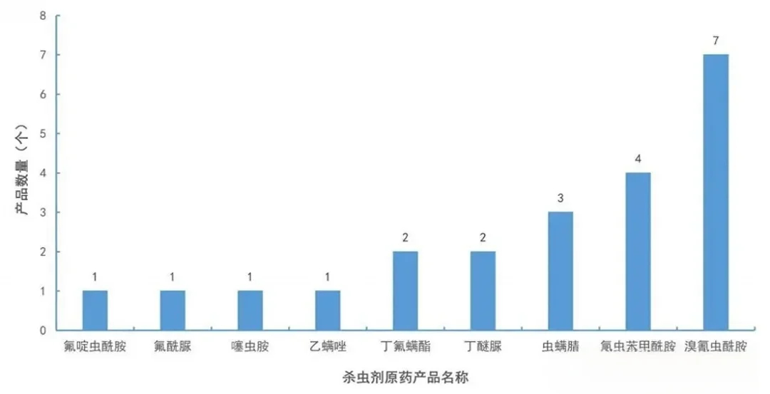 以邻甲酰胺类为代表的高效杀虫剂继续主导市场。溴氰虫酰胺(7个)和氯虫苯甲酰胺(4个)的登记数量合计占据该品类半数以上份额。虫螨腈(3个)也保持着较高的市场关注度。