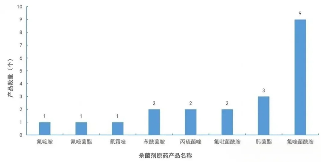 氟唑菌酰胺以9个登记数量脱颖而出,其市场优势地位进一步巩固。肟菌酯(3个)作为经典品种,依然是企业布局的重点。此外,苯酰菌胺、丙硫菌唑和氟吡菌酰胺等也具备较强的市场竞争力。