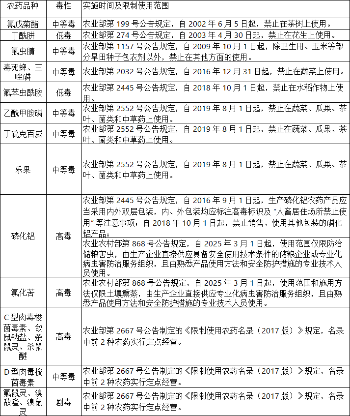 备注:①农业农村部第736号公告规定,氧乐果、克百威、灭多威、涕灭威制剂产品自2026年6月1日起禁止销售和使用;②农业部第2289号公告规定自2015年10月1日起,撤销杀扑磷在柑橘树上的登记,禁止杀扑磷在柑橘树上使用。由于杀扑磷仅登记在柑橘树上使用,目前无制剂登记,实际已被禁用;③农办农〔2011〕10号规定,鉴于五氯酚钠对环境存在较大风险,卫生系统已停止用于钉螺的防治,建议不再批准新增登记,不批准临时登记转正式登记的申请,对现有登记产品不再续展。目前已无制剂产品登记,实质上已被禁用;④《高毒农药淘汰和禁用工作方案》规定全面停止高毒农药的新增登记和生产许可,内吸磷、硫环磷、氯唑磷属于高毒农药,目前已无制剂产品登记,实质已被禁用;⑤农业部第2552号公告规定自2019年1月1日起,将含溴甲烷产品的农药登记使用范围变更为“检疫熏蒸使用”,禁止含溴甲烷产品在农业上使用。