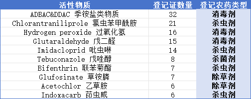 公共卫生与设施消毒需求稳固: 消毒剂类产品依旧是登记的热门。季铵盐类化合物(32项登记)、过氧化氢(16项)和戊二醛(15项)位居前列,显示出后疫情时代下,公共卫生和农业设施消毒市场的持续刚性需求。