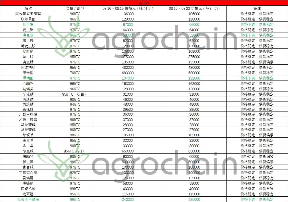 下跌品种分析:但另一些产品就惨了,他们的情况正好相反:工厂生产的太多,但买家买的又少,导致货压在手里卖不出去,价格只能一个劲儿地往下降。杀虫剂就是这次降价最严重的领域。高端产品氯虫苯甲酰胺价格大幅下跌5000元,吡虫啉、噻虫嗪等常规品种也未能幸免。此外,除草剂中的莠去津和杀菌剂中的噁霉灵等,也因市场竞争激烈,价格继续下跌。