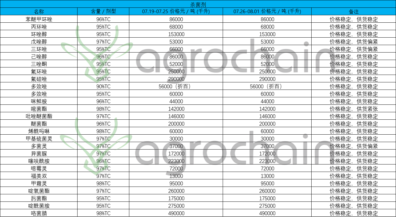 杀菌剂市场大部分产品价格稳定,供货正常。