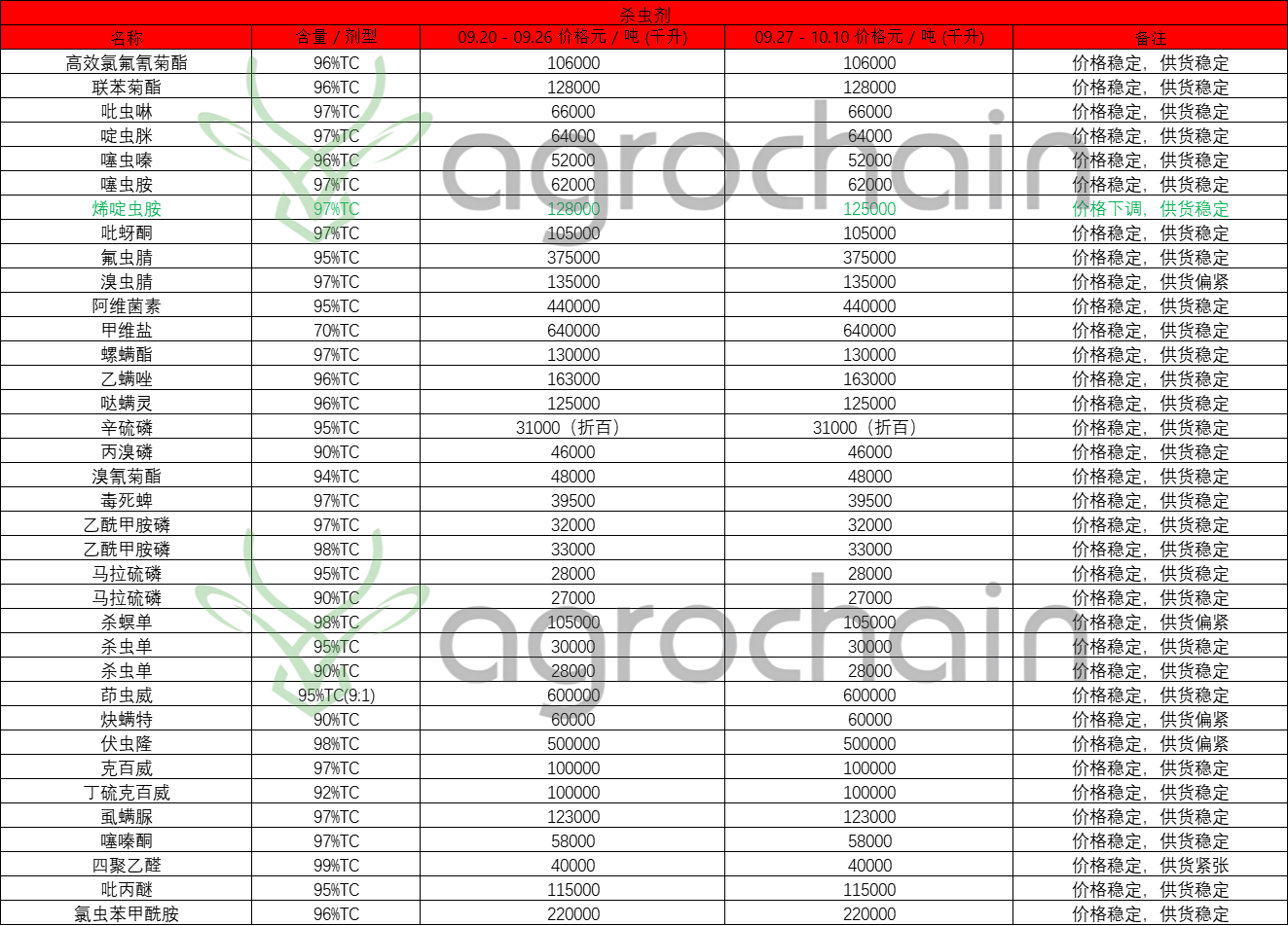烯啶虫胺价格有所下调,由 128000 元 / 吨(千升)降至 125000 元 / 吨(千升),供应稳定