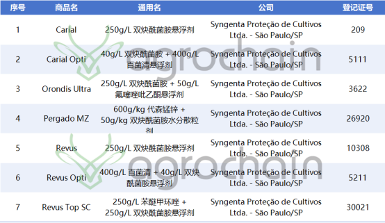 巴西天气热、雨水多,病害容易爆发,所以登记的7款产品里,5款都是复配药: