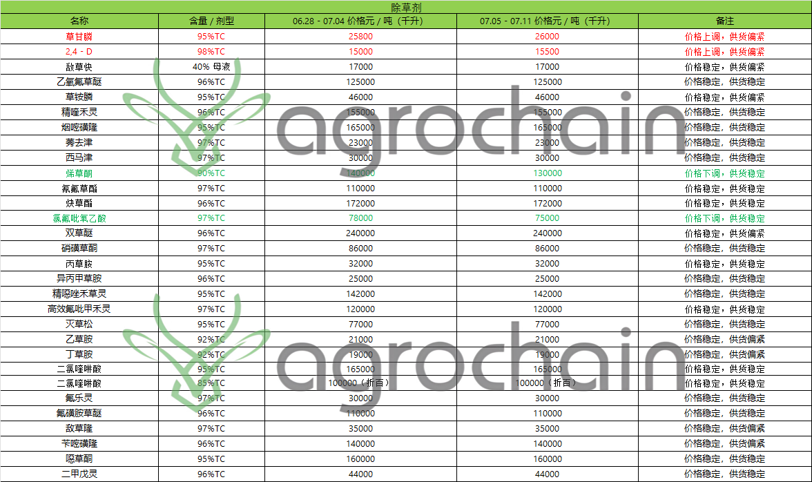 2,4-D(98%):上涨500元,报15,500元/吨。