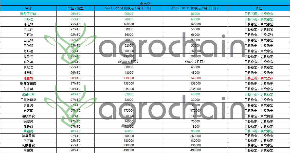 苯醚甲环唑、丙环唑、烯酰吗啉、甲霜灵等主流品种价格小幅下调1,000至2,000元。